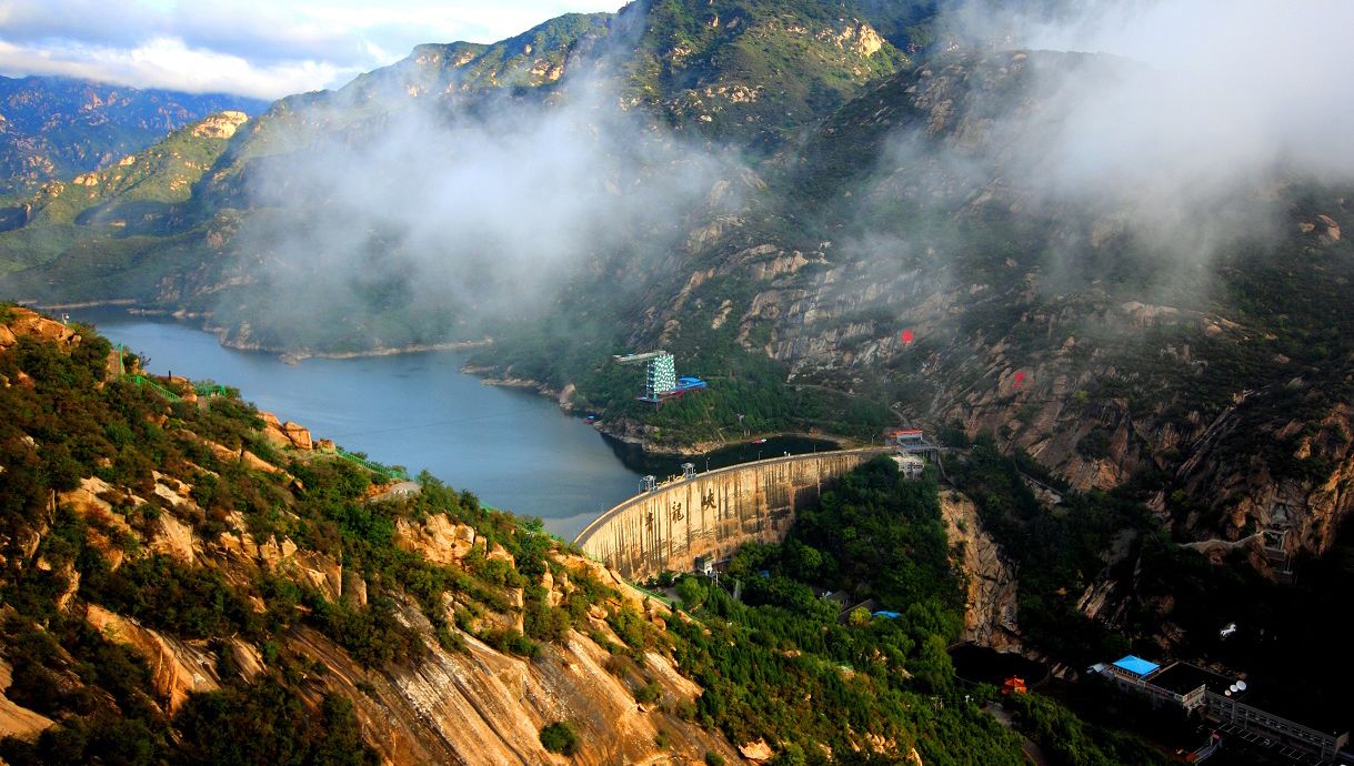 Fifteen kilometers north of Huairou town, Qinglong Gorge squeezes the Great Wall, a 59-meter concrete arch dam and a long, tree-lined reservoir into one compact 150-hectare site. A chair-lift climbs to a ridge where the Wall runs across pine-topped peaks; from the same platform a zip-line drops to the lake, and bamboo rafts drift between rocky cliffs and reflected battlements.