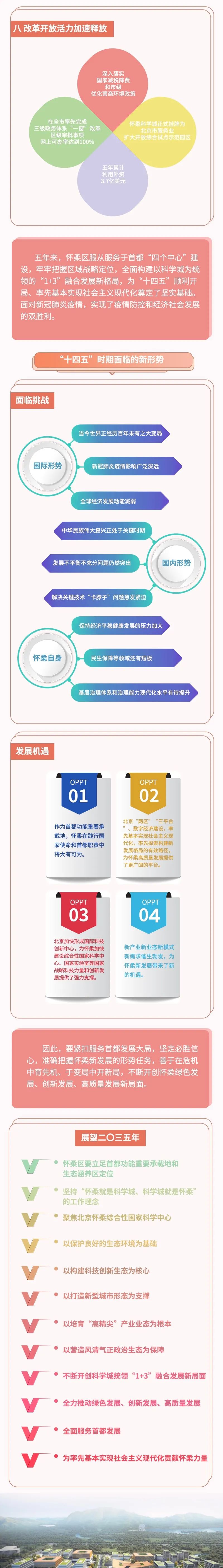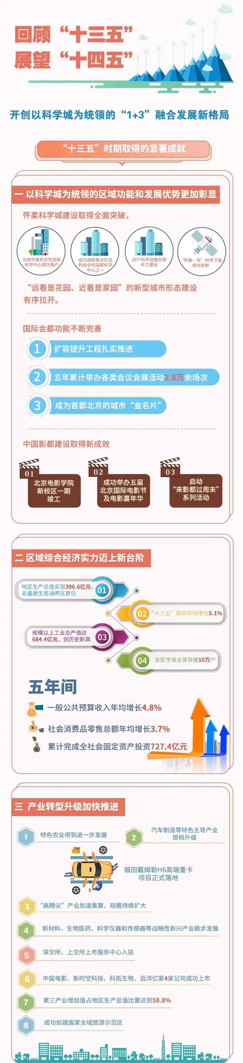 2021年是“十四五”规划的开局之年,“十四五”时期是怀柔聚焦综合性国家科学中心,系统推进“五态”建设,构建以科学城为统领、“1+3”融合发展新格局的重要战略机遇期。怀柔区制定了《北京市怀柔区国民经济和社会发展第十四个五年规划和二〇三五年远景目标纲要》,未来五年,怀柔如何绘就发展新蓝图,让我们一图了解。